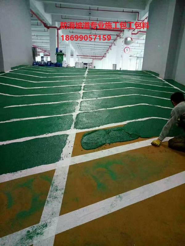 地下樓層停車場的上下坡道采用彩色顆粒防滑坡
